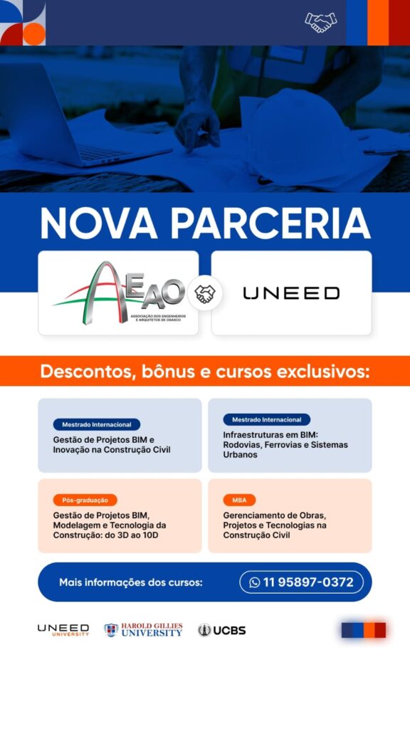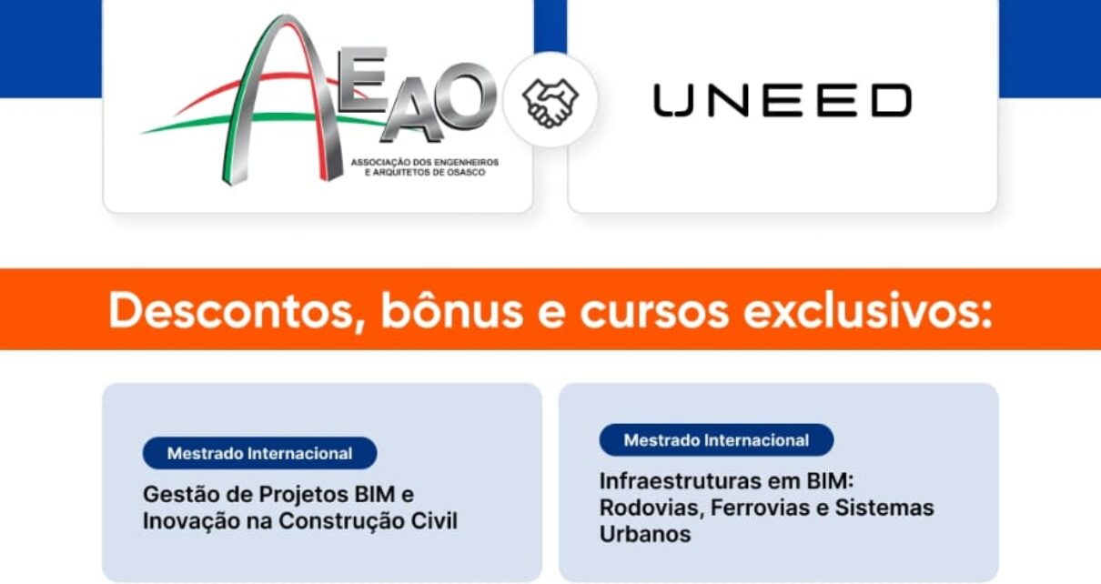 A Associação dos Engenheiros e Arquitetos de Osasco (AEAO) acaba de firmar uma importante parceria com a Uneed University, que vai garantir aos associados descontos exclusivos, bônus especiais e acesso a cursos de alto nível na área de engenharia e construção civil.