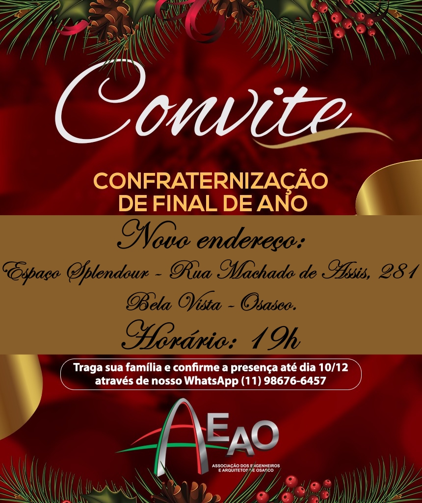 A confraternização da AEAO, que acontecerá no sábado, 14 de dezembro, mudou a data e o local da festa.