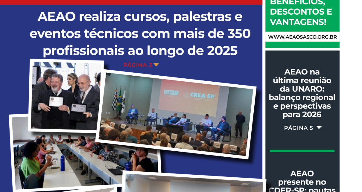 A nova edição destaca os 64 anos de Osasco e o papel da engenharia no desenvolvimento da cidade, além das principais ações da Associação neste início de ano. Nesta edição: ✔ Curso sobre Incorporação com foco no Método Nexialista ✔ Anuidade AEAO 2026 mantida sem reajuste ✔ Palestra sobre Carregadores Veiculares – Wallbox e Estações […]