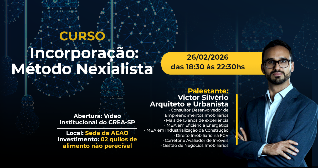 A Associação dos Engenheiros e Arquitetos de Osasco (AEAO) convida seus associados e profissionais da área para participarem do Curso Incorporação: Método Nexialista, que será realizado no dia 26 de fevereiro de 2026, das 18h30 às 22h30, na sede da AEAO. A abertura do encontro contará com a exibição do Vídeo Institucional do CREA-SP, reforçando […]
