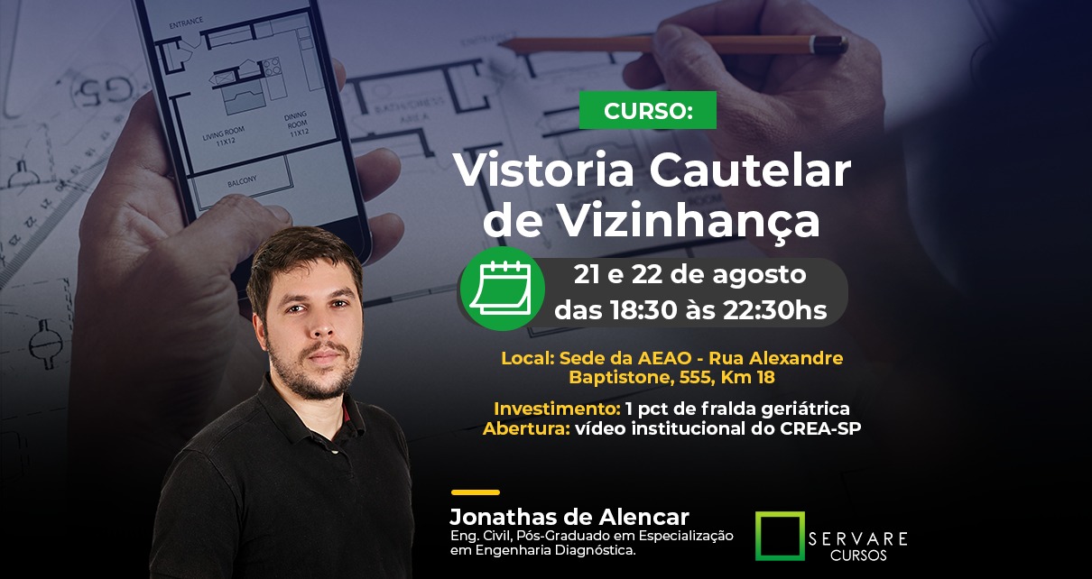 A Associação dos Engenheiros e Arquitetos de Osasco (AEAO) abriu as inscrições para o curso de “Vistoria Cautelar de Vizinhança”, que será realizado nos dias 21 e 22 de agosto de 2024, das 18:30 às 22:30, na sede da AEAO, localizada na Rua Alexandre Baptistone, 555, KM 18.